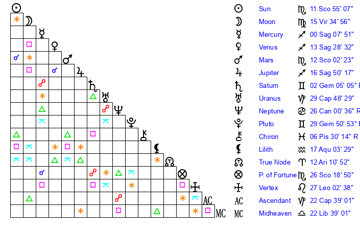 Moon | 15 Virgo 32 | 18 Sagittarius 24 | 25 Libra 39 |