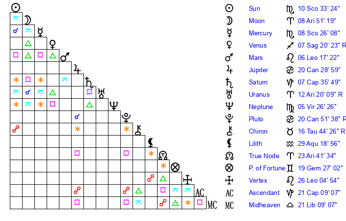 | Moon | 8 Aries 56 | 15 Aries 29 | 8 Libra 23 |