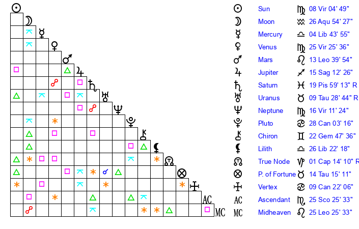 | Sun | 8 Virgo 5 | 8 Virgo 32 | 6 Sagittarius 18 |