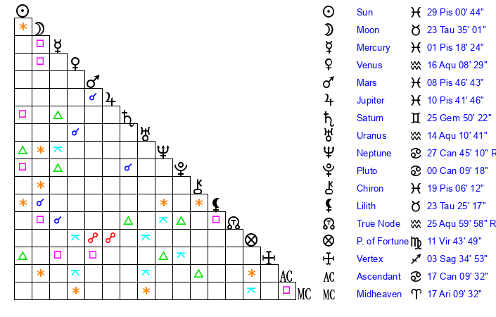| Moon | 23 Taurus 32 | 10 Sagittarius 10 | 4 Gemini 40 |