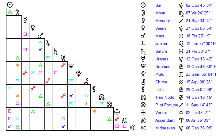| Sun | 2 Capricorn 46 | 4 Capricorn 24 | 0 Taurus 12 |