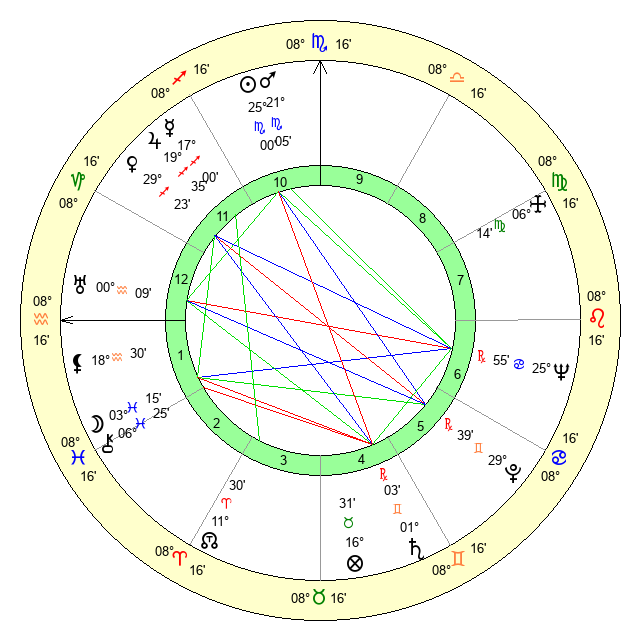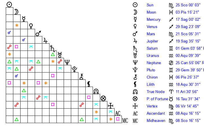 Sun | 25 Scorpio 0 | 25 Scorpio 50 | 18 Pisces 32 |