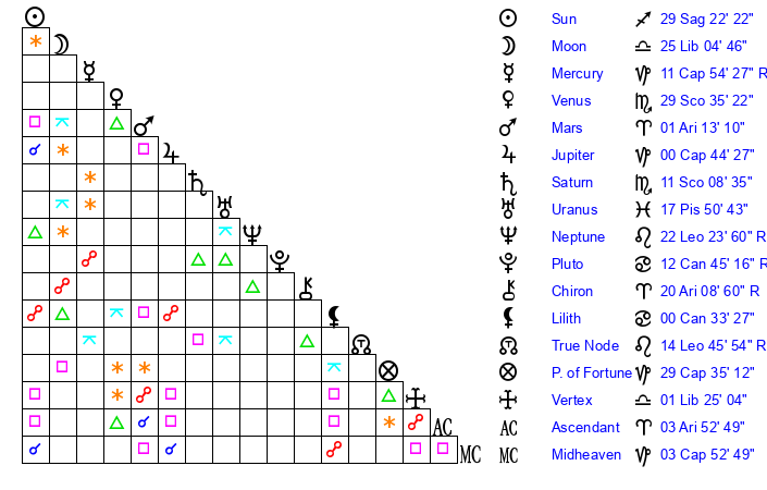| Sun | 29 Sagittarius 22 | 0 Capricorn 7 | 10 Aries 16 |