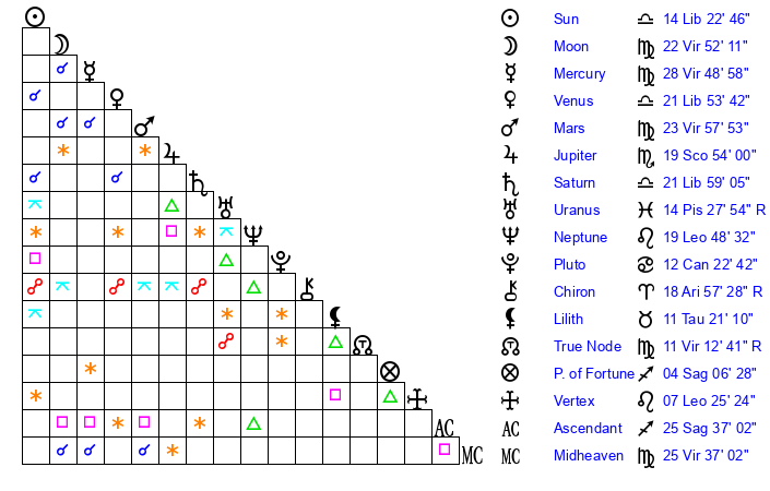 | Saturn | 22 Libra 33 | 27 Pisces 4 | 2 Scorpio 26 |