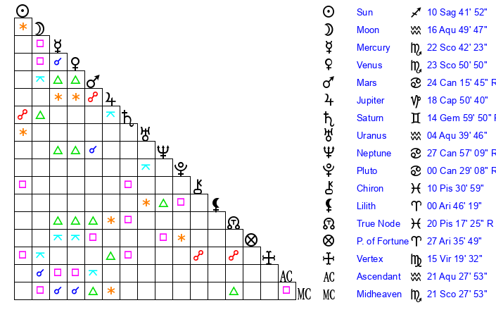 | Moon | 16 Aquarius 57 | 7 Capricorn 28 | 7 Pisces 51 |