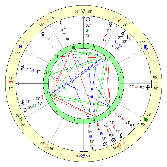 | Moon | 0 Taurus 19 | 22 Libra 30 | 2 Sagittarius 41 |
