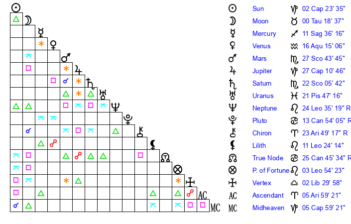| Moon | 0 Taurus 19 | 22 Libra 30 | 2 Sagittarius 41 |