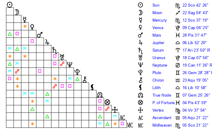 | Sun | 22 Scorpio 42 | 23 Scorpio 49 | 19 Pisces 15 |