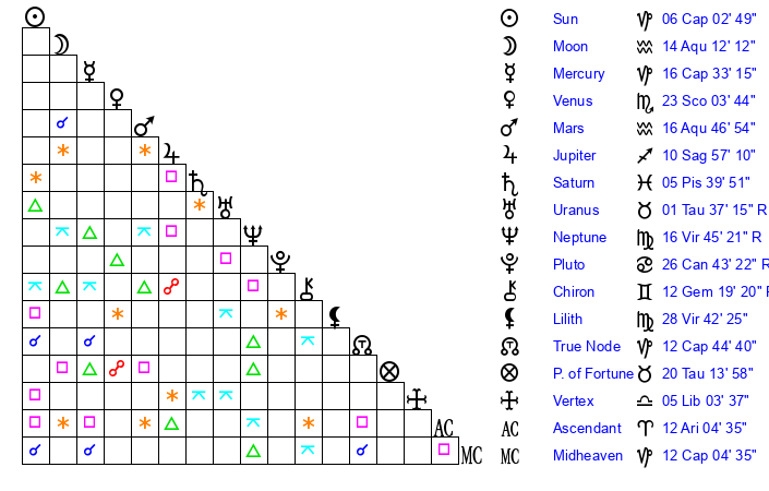 | Mars | 16 Aquarius 47 | 10 Capricorn 10 | 26 Aries 9 |