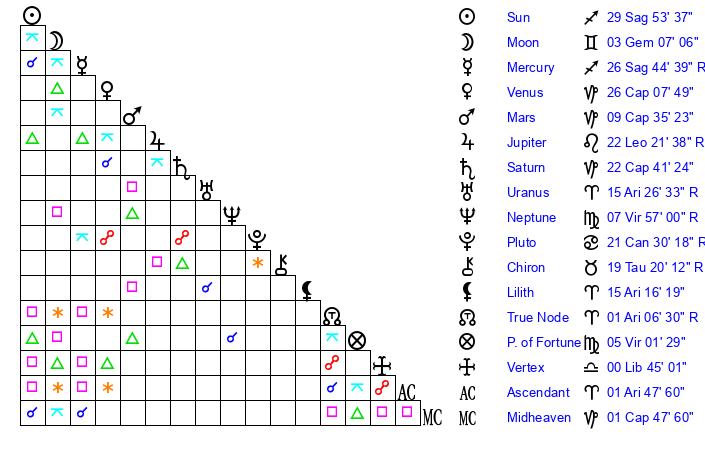 | Sun | 29 Sagittarius 54 | 1 Capricorn 21 | 3 Aries 51 |