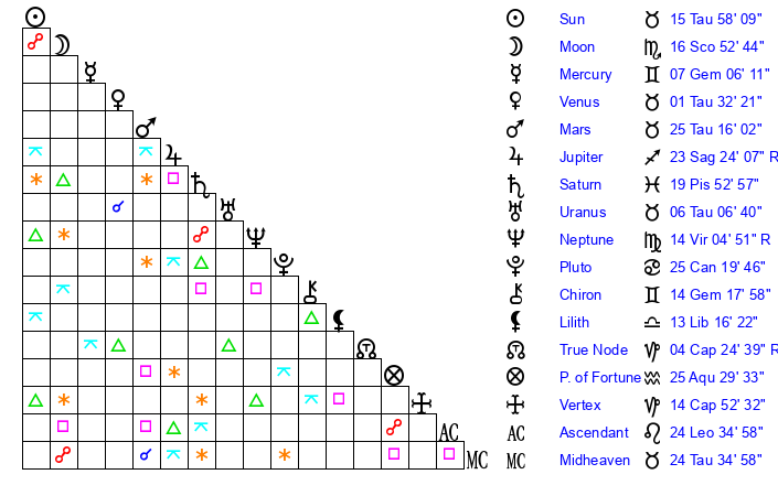 | Sun | 15 Taurus 58 | 16 Taurus 25 | 11 Leo 8 |