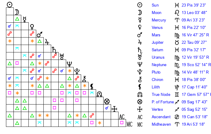 Venus | 16 Pisces 23 | 7 Aries 41 | 0 Gemini 40 |