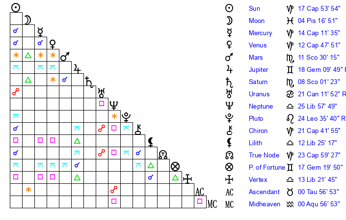 | Venus | 12 Capricorn 48 | 18 Capricorn 54 | 12 Aries 56 |