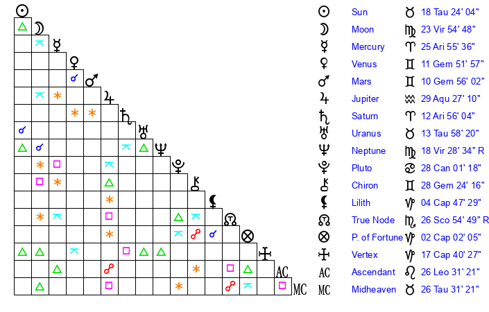 | Sun | 18 Taurus 24 | 19 Taurus 19 | 11 Leo 38 |