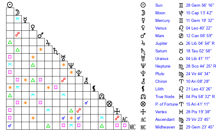 Sun | 28 Gemini 56 | 29 Gemini 37 | 21 Leo 29 |