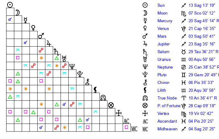 Moon | 6 Scorpio 59 | 7 Aquarius 0 | 14 Sagittarius 58 |