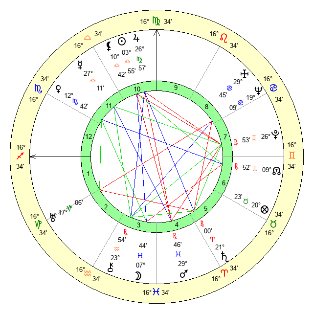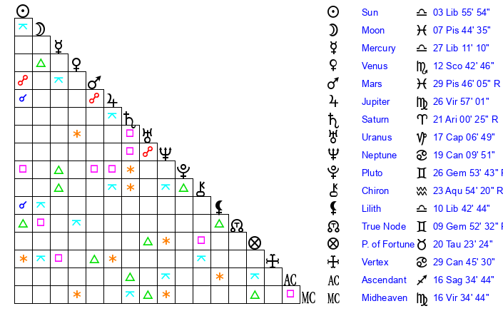 | Venus | 12 Scorpio 43 | 10 Virgo 1 | 0 Pisces 54 |