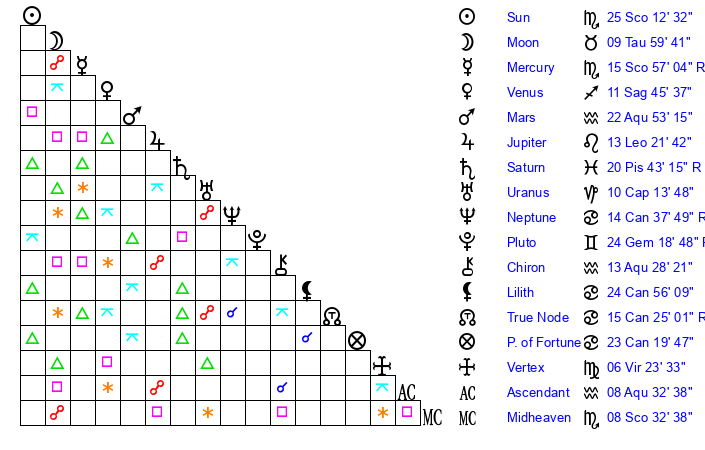 | Sun | 25 Scorpio 13 | 26 Scorpio 36 | 24 Pisces 43 |
