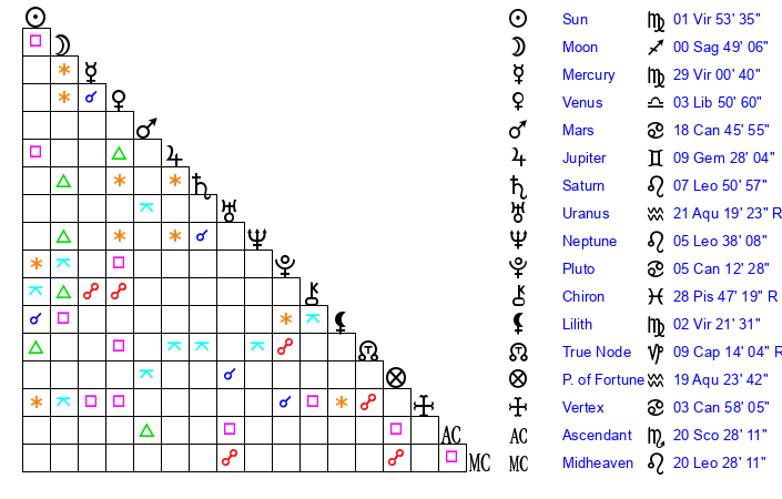 | Sun | 1 Virgo 53 | 2 Virgo 45 | 19 Sagittarius 6 |