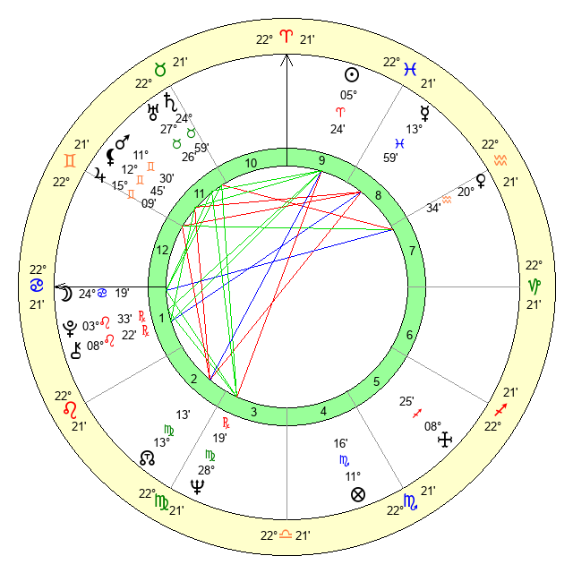 | Moon | 24 Cancer 13 | 28 Aquarius 29 | 7 Leo 54 |