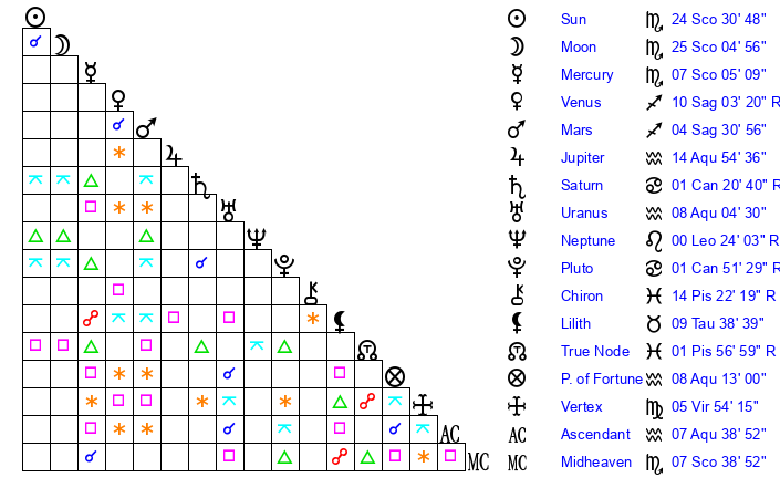 | Sun | 24 Scorpio 31 | 25 Scorpio 50 | 16 Pisces 3 |