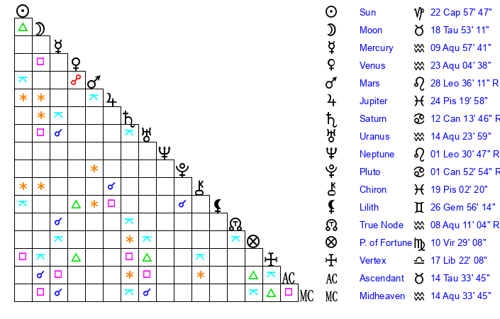 | Mercury | 9 Aquarius 58 | 8 Capricorn 46 | 29 Taurus 38 |