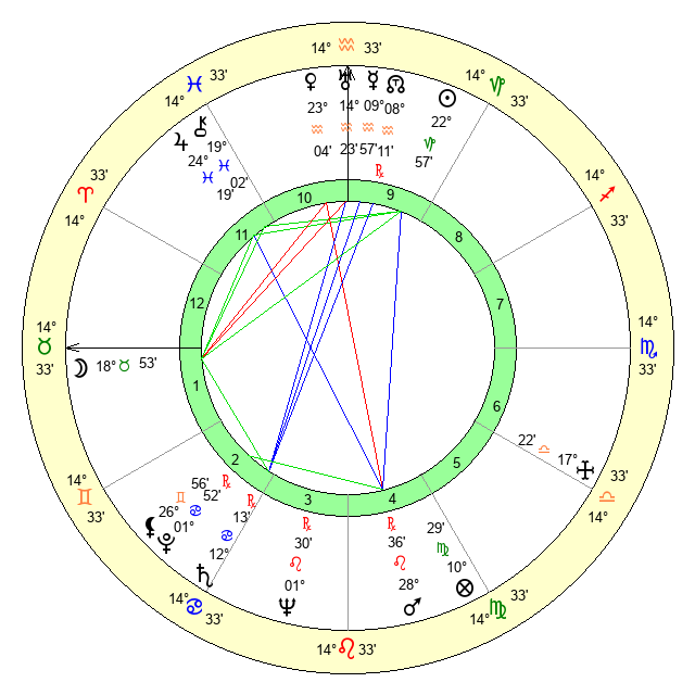| Moon | 18 Taurus 55 | 0 Leo 57 | 14 Taurus 14 |