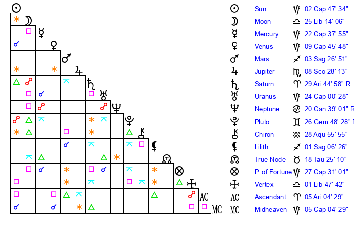 Sun | 2 Capricorn 48 | 4 Capricorn 9 | 27 Aries 18 |