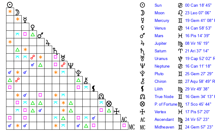 | Pluto | 25 Gemini 28 | 3 Aquarius 18 | 26 Gemini 49 |