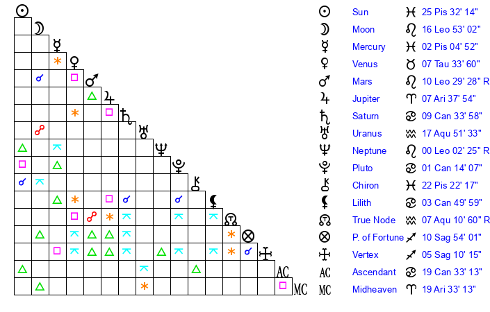 | Moon | 16 Leo 51 | 19 Libra 46 | 13 Leo 50 |