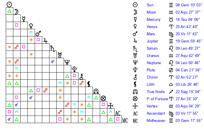 | Sun | 8 Gemini 10 | 9 Gemini 15 | 20 Virgo 46 |