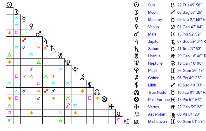 Sun | 22 Taurus 46 | 24 Taurus 9 | 12 Virgo 0 |