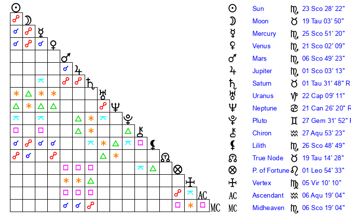 Sun | 23 Scorpio 28 | 24 Scorpio 50 | 19 Pisces 1 |