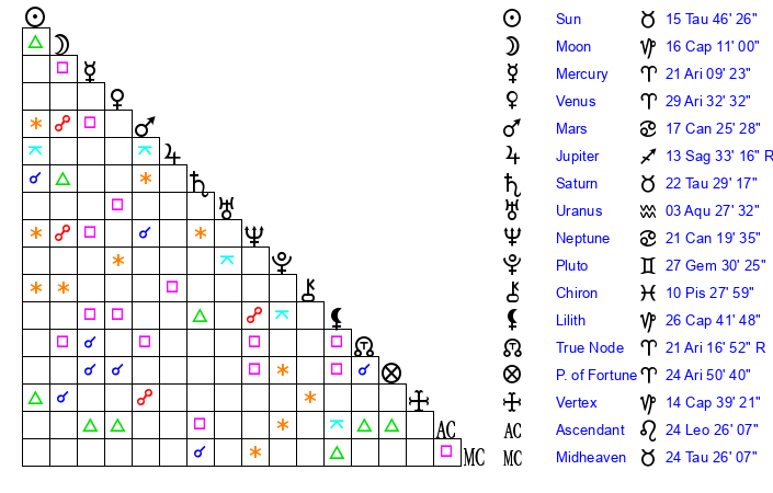 Sun | 15 Taurus 46 | 16 Taurus 25 | 4 Virgo 1 |