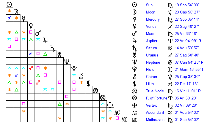 | Mercury | 27 Scorpio 7 | 6 Sagittarius 11 | 25 Pisces 50 |