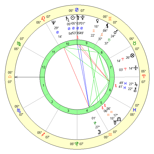 | Sun | 5 Cancer 53 | 7 Cancer 15 | 22 Libra 14 |