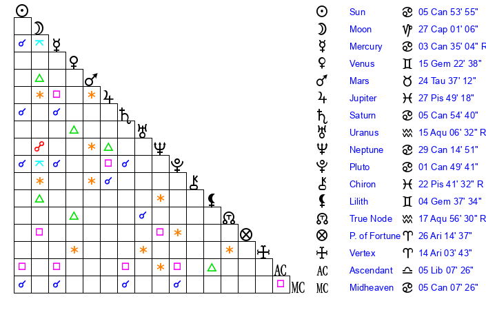 | Sun | 5 Cancer 53 | 7 Cancer 15 | 22 Libra 14 |