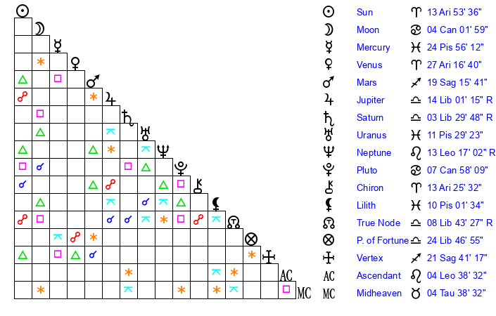 | Saturn | 4 Libra 14 | 24 Pisces 49 | 2 Libra 57 |