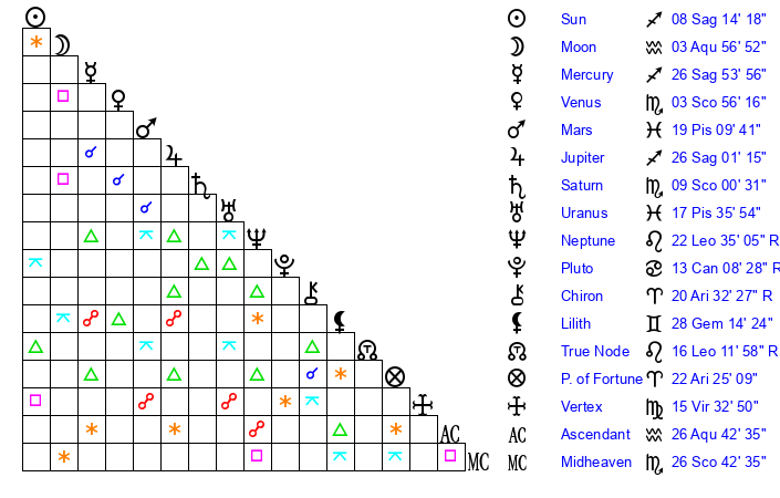 | Sun | 8 Sagittarius 14 | 8 Sagittarius 59 | 19 Pisces 37 |