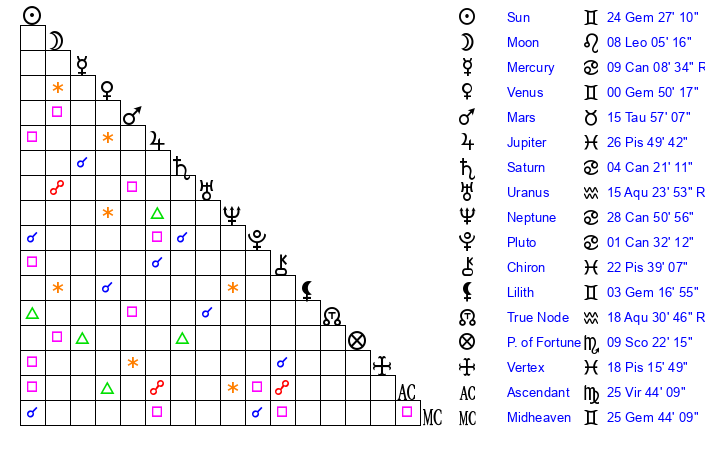 | Sun | 24 Gemini 26 | 25 Gemini 48 | 10 Libra 22 |