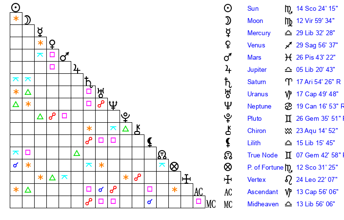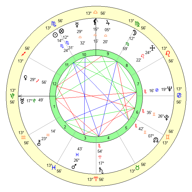 | Moon | 13 Virgo 3 | 23 Capricorn 26 | 20 Scorpio 24 |
