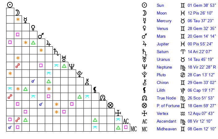 | Neptune | 18 Virgo 22 | 1 Aries 41 | 19 Virgo 54 |