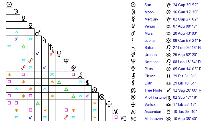 | Mars | 20 Aquarius 42 | 26 Cancer 22 | 12 Taurus 11 |