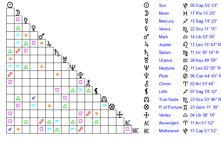 | Moon | 17 Pisces 17 | 10 Sagittarius 59 | 22 Capricorn 54 |