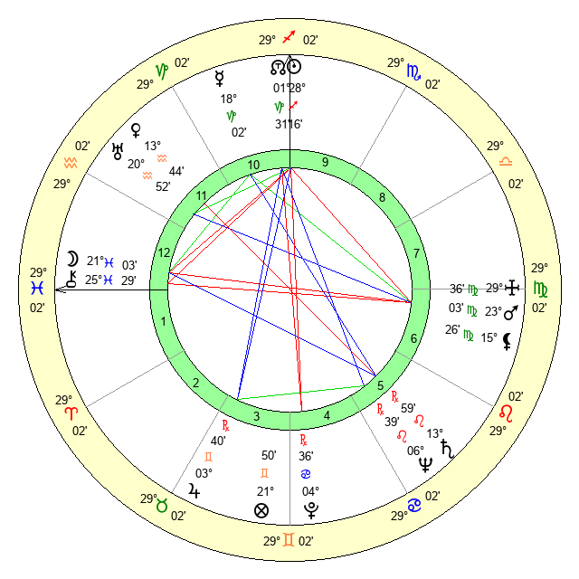 | Moon | 21 Pisces 1 | 4 Virgo 51 | 13 Aquarius 32 |