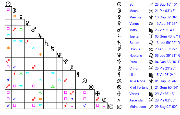 | Sun | 28 Sagittarius 16 | 29 Sagittarius 18 | 16 Aries 4 |