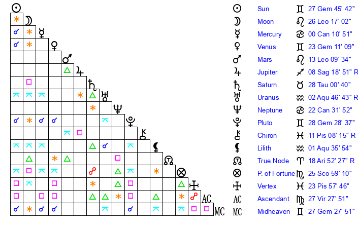 Sun | 27 Gemini 45 | 28 Gemini 25 | 16 Libra 46 |