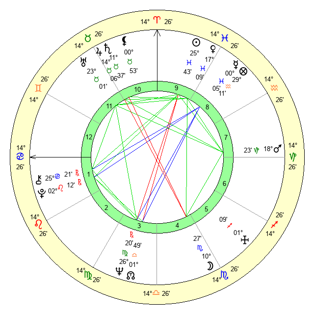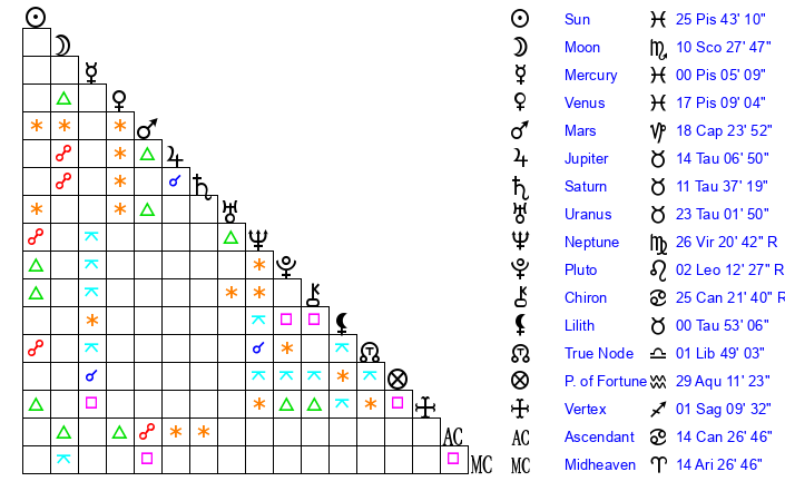 | Sun | 25 Pisces 43 | 26 Pisces 21 | 17 Gemini 29 |