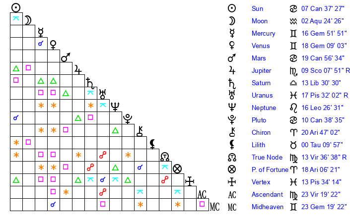 | Moon | 2 Aquarius 22 | 12 Virgo 28 | 18 Libra 54 |