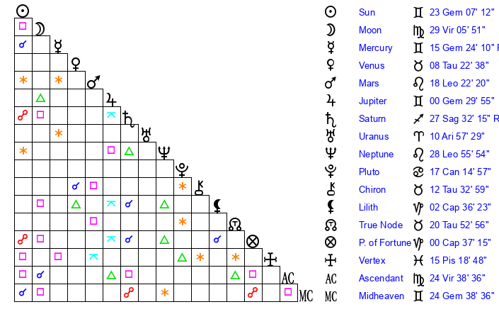 | Sun | 23 Gemini 7 | 23 Gemini 53 | 25 Virgo 17 |